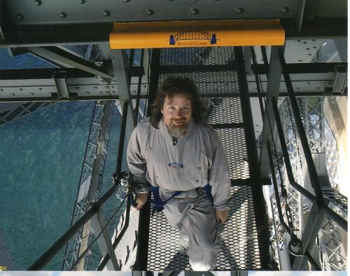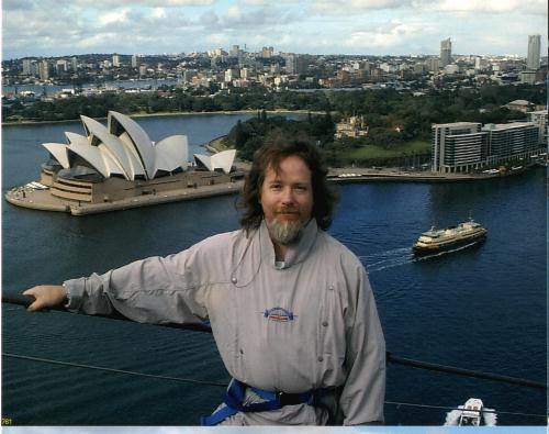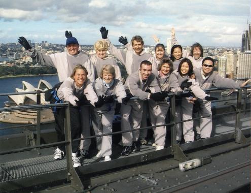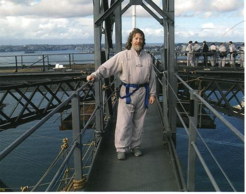 Out to Cumberland street, down half a block to the entrance to the bridge. Up some stairs to a tunnel cut through the pier. Latch on and start walking the catwalk under the bridge approach. Lots of commentary by Graeme. History of the bridge and information about the park and cannons below us. 40000 granite blocks cover the Pylons. Lots of interesting facts about the bridge. Through the Pylon (its hollow, the bridge maintenance facilities are inside, workplace for the 116 people representing 18 trade unions who maintain the bridge). Head out on the catwalk under the east side of the bridge to where there are some ladders to the upper chord of the bridge. Up the four ladders, one person per segment. On the top of the upper chord we walk under the maintenance crane and begin the ascent up the long curved upper chord. More commentary and pointing out the sights of Sydney harbour. Fantastic view and wonderful weather, perhaps a bit cool but it is Winter. At the top Graeme takes 3 photos of each of the parties in our group. Across the catwalk at the top and down the West side upper chord. Down the corresponding West side stairs through the road deck and back on the catwalks, through the pylon, catwalks under the bridge approach, latch off and back to the radio room. Taking the gear off is not quite as elaborate as putting it on. Done and on to buy the pictures.