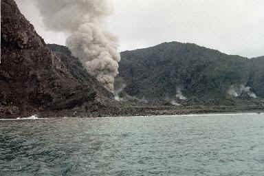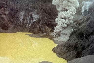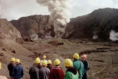 On the wall of the crater we are shown the monitoring equipment, seismic sensors, Temperature sensors and a rain gauge. The volcano was at Alert Level 2 because it was spewing ash. At the time the wind is blowing the plume away from us so we didn't expect any problems. We walk across a stream and are given the opportunity to taste it. It is warm and bitter. We go past a small crater made by a rock thrown during an eruption; our hard hats would have been of little use. As we walk towards Donald Duck crater, the old main crater which now covered in a cracked layer of black ash, we can hear a low roar. When we get to the edge of the main crater we look down some 60m to the bottom and see a sulphorous yellow lake To the right is the fumeral, roaring as white and gray steam rolls out of it. The wind has afforded us an excellent view and we can even see the vent. William gets a bit close to the edge and Jeanie puts her hand on his shoulder to keep him safe. I find that reassuring as I am starting to wonder why I was crazy enough to want to come here.