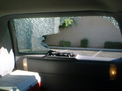 We didn't want to drive on with a broken rear window and it was Sunday so we could not contact the insurance company. Instead we took a day off and went to see Shrek 2, swam in the hotel pool, and went out to dinner. It was, after all, fathers day and our wedding anniversary.